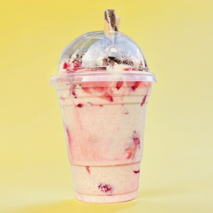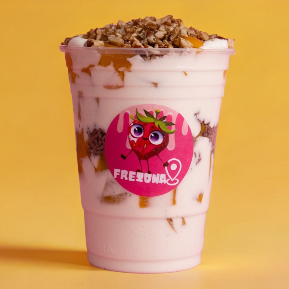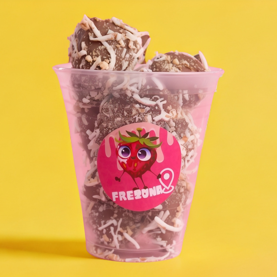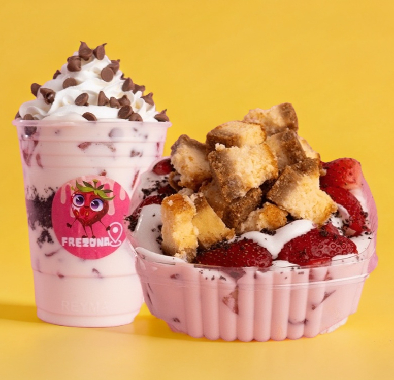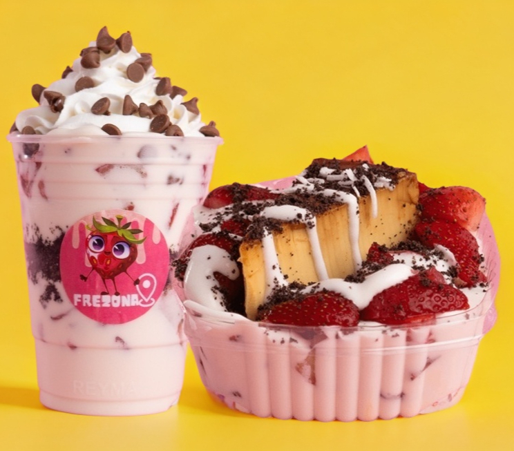 Fresas con crema en tu vaso coleccionable Frezona, disfruta de tu postre favorito con un toque de estilo.
