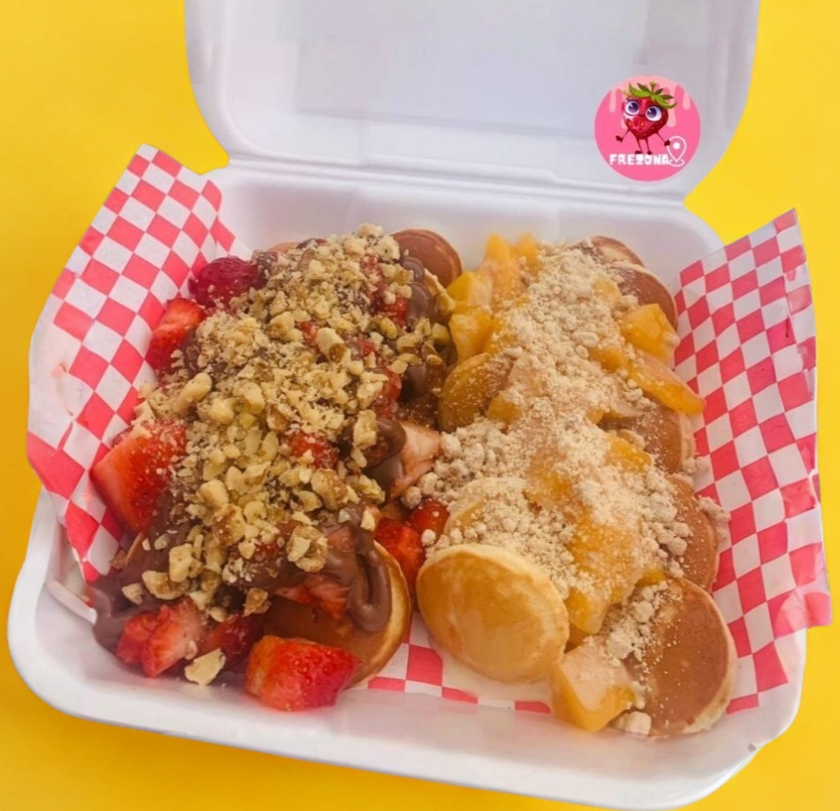 25 Mini pancakes. 1 Untable, 2 toppings y una fruta. Vuelve tu orden especial agregando crema de la casa.