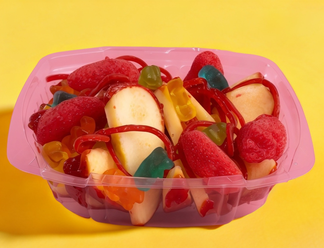 Una pieza de manzana cubierta con delicioso tamarindo chilosito; partida en gajos. agregamos gomitas de mango, panditas y skwinkles salsagueti, bañados con chamoy y un toque de tajín y miguelito.