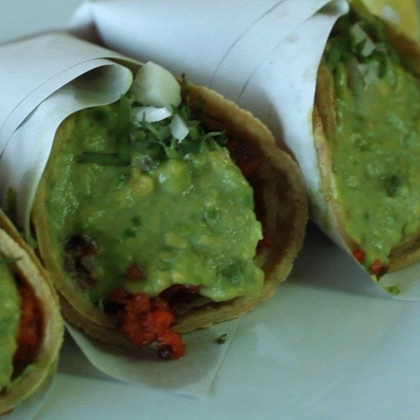 Longaniza, tortilla de maíz, guacamole, cilantro, cebolla, limones y salsas.