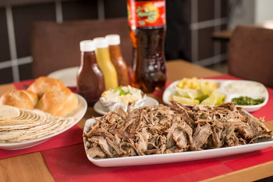 Carne árabe, tortilla de maíz, pan árabe, salsas y limones.