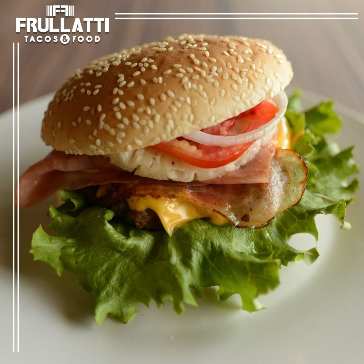 Carne 100% de res con queso jitomate, tocino, lechuga, cebolla, piña, mayonesa, jamón, catsup, mostaza y picante