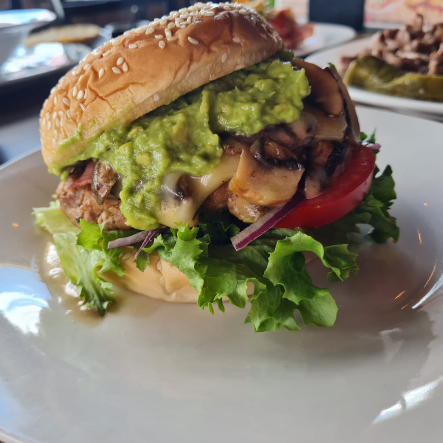 Carne 100% de res con queso manchego, jitomate, champiñones, lechuga, cebolla, catsup, guacamole, mostaza y picante