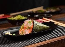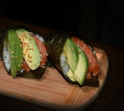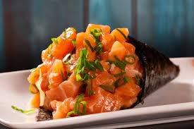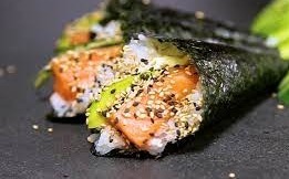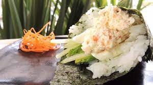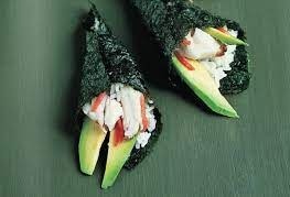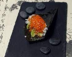 Sushi en forma de cono relleno de aguacate, pepino, queso y marisco.