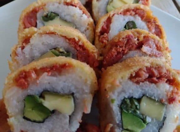 Aguacate, pepino, queso, filete de res, alga marina, arroz y empanizado. 10 Unidades.