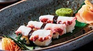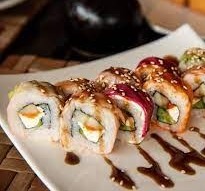 Adentro: aguacate, queso crema, masago y pepino. Por fuera, cangrejo, pulpo, camarón, salmón y aguacate bañado en salsa de anguila y ajonjolí. 10 Unidades.