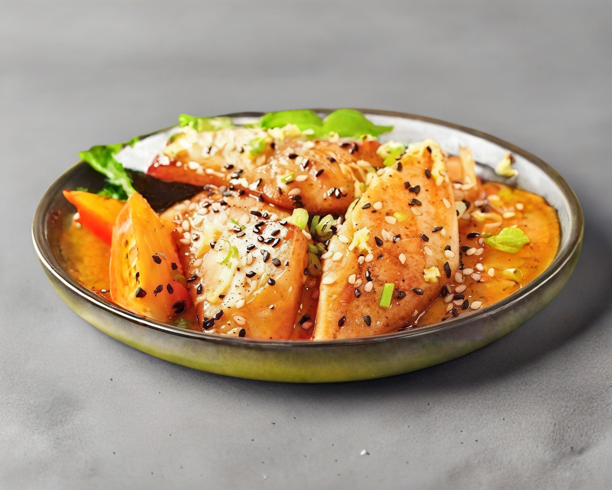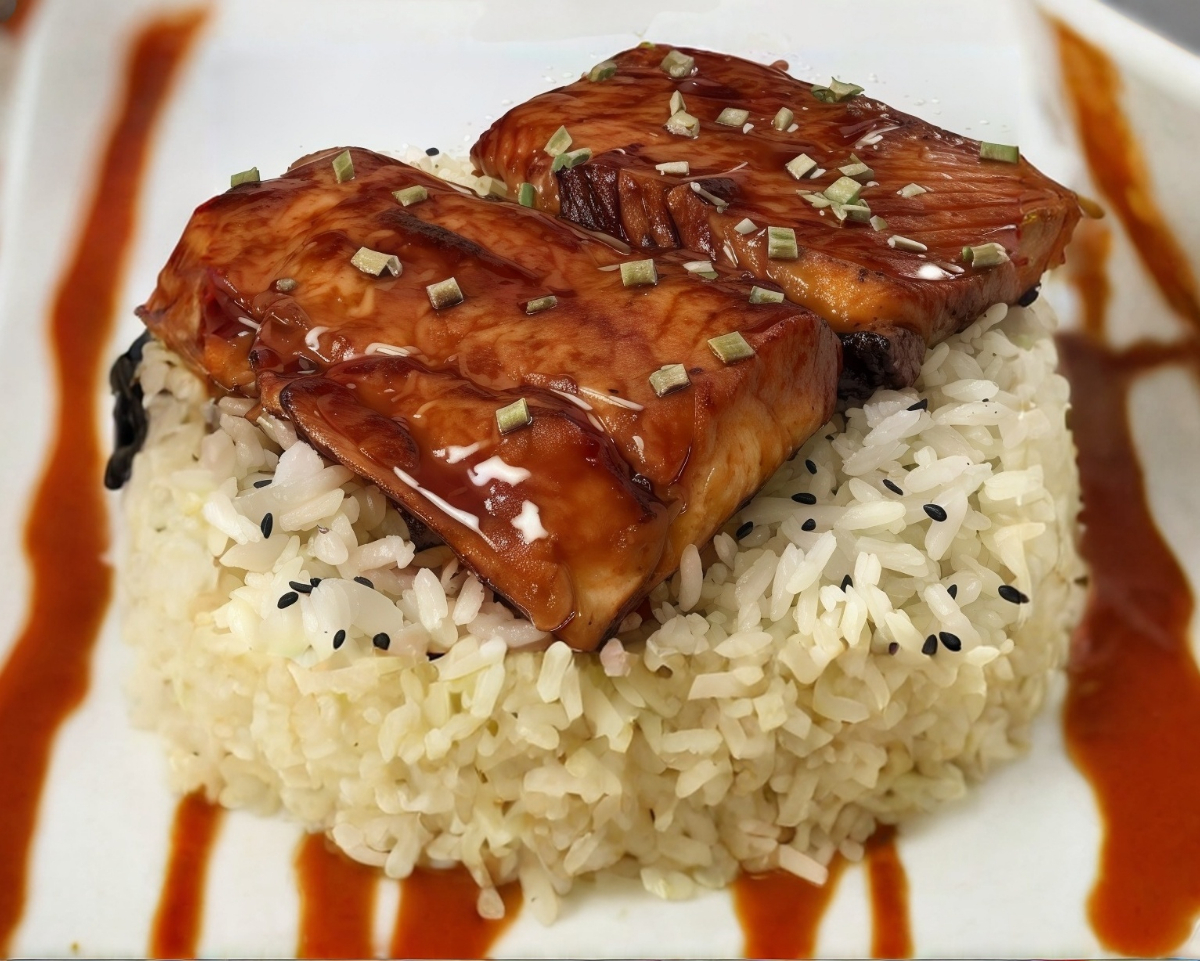 Asada o a la plancha con brócoli marinada en salsa agridulce en una cama de gohan.