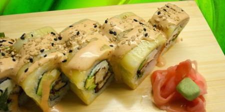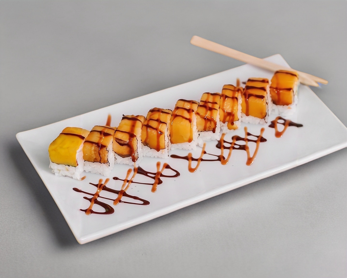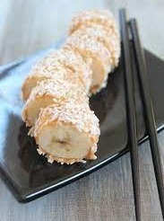 Aguacate, pepino, queso, masago, alga marina, arroz y plátano macho por fuera, acompañado de ajonjolí y salsa de anguila. 10 Unidades.