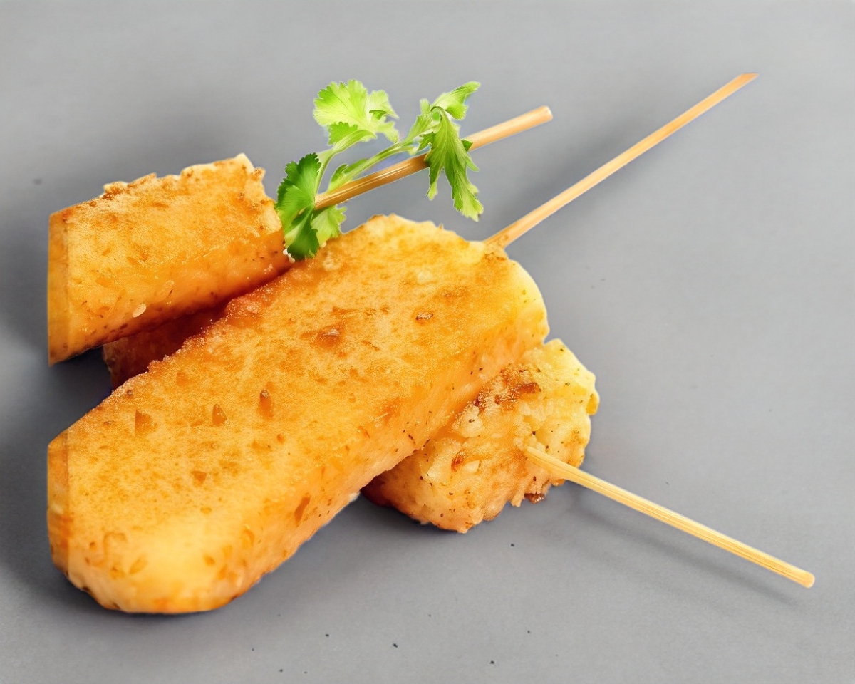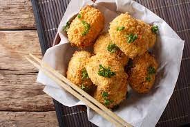 Bola de arroz empanizada rellena de pulpo, cangrejo, camarón, queso Philadelphia, masago, aguacate. Encima salsa de anguila y ajonjolí.
