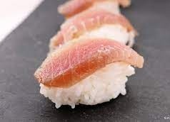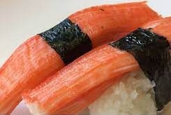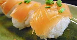 Bocadillos de arroz prensado y mariscos sobre puestos.