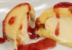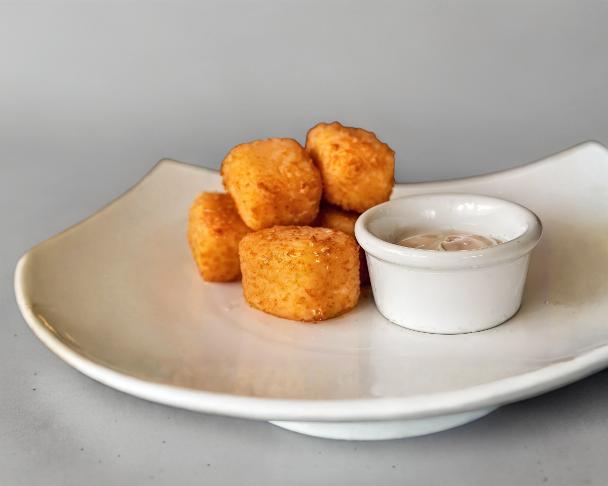 Palomitas de queso Philadelphia crujientes acompañadas con helado de vainilla, bañado en salsa de zarzamora.