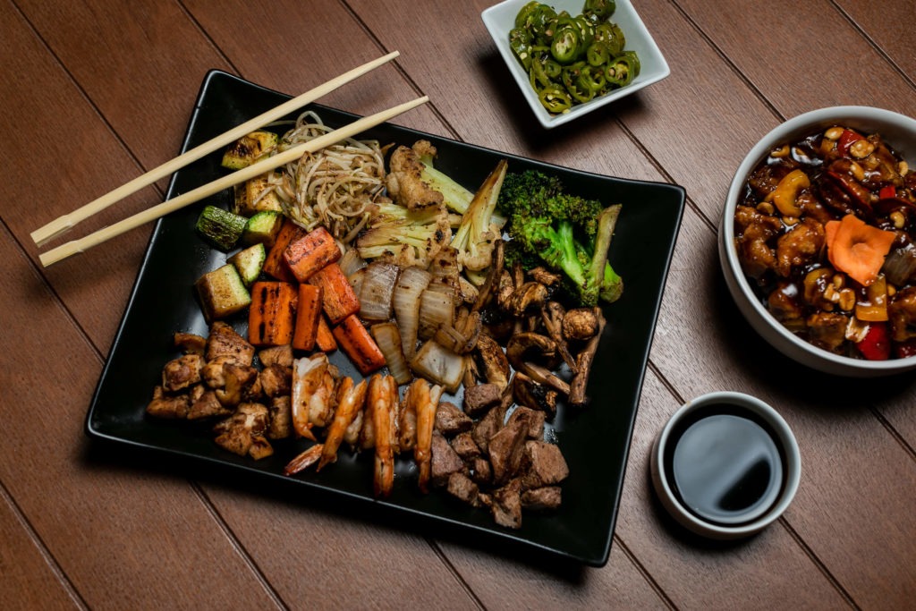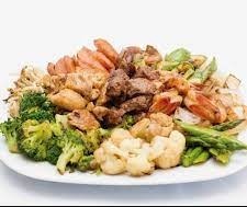 Verduras asadas a la plancha, con brócoli, coliflor, calabaza, zanahoria, champiñón, cebolla y germen de soya, acompañados con carne o mariscos de su elección.