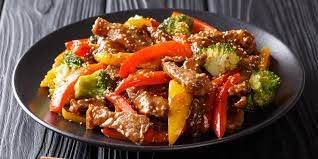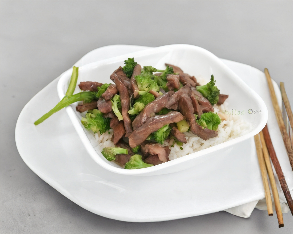 Asada o a la plancha con brócoli, marinada en salsa agridulce en una cama de gohan.