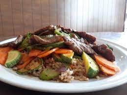 Verduras asadas a la plancha: brócoli, coliflor, calabaza, zanahoria, champiñón, cebolla y germen de soya, acompañados con carne o mariscos de su elección.