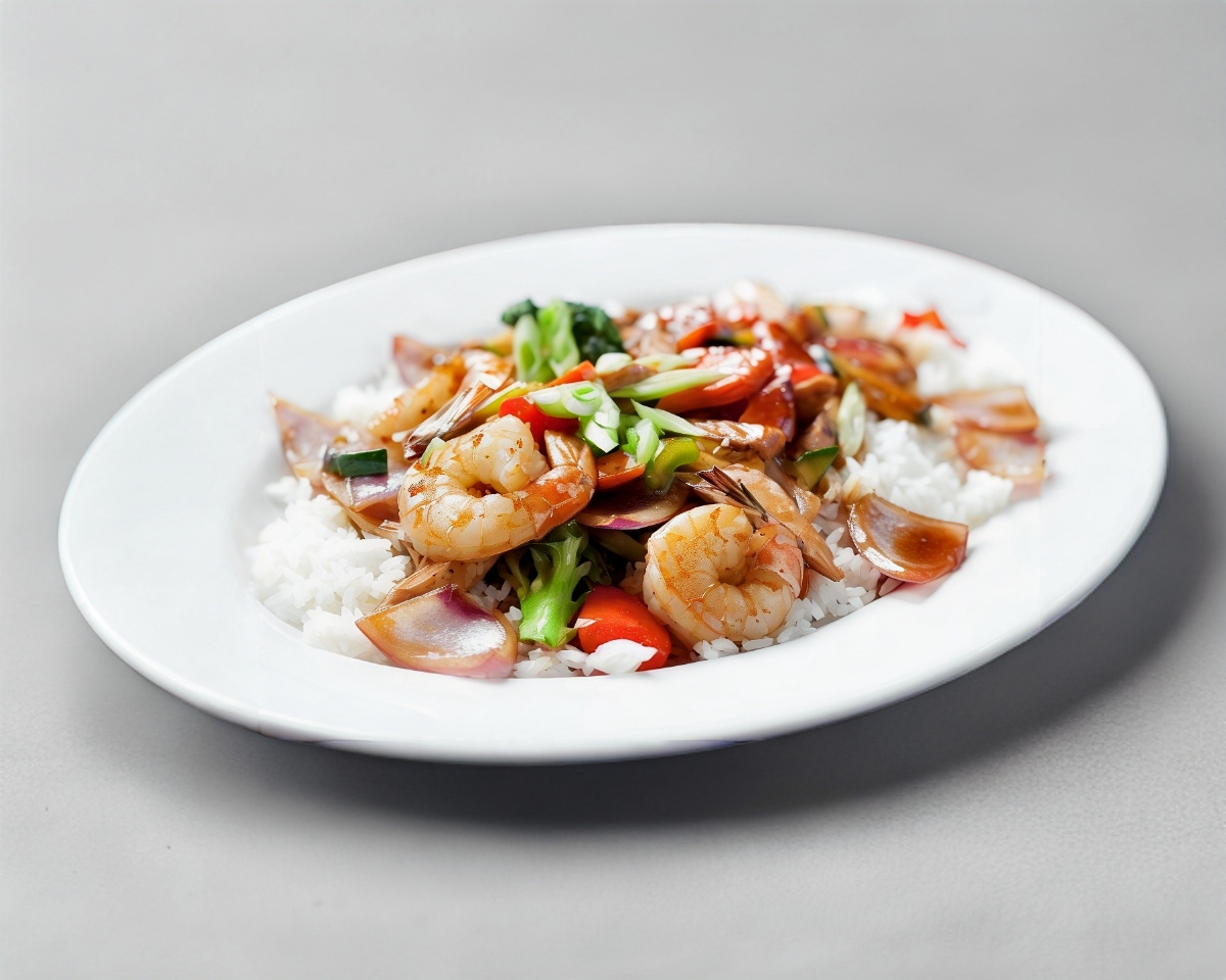Arroz frito a la plancha con verduras mixtas, pollo, res y camarón.