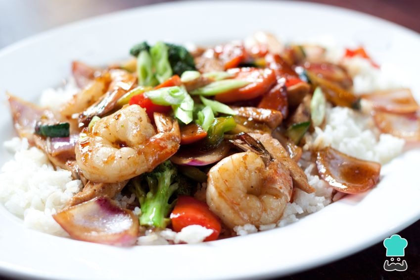 Arroz frito a la plancha con verduras mixtas, pollo, res y camarón (receta especial).