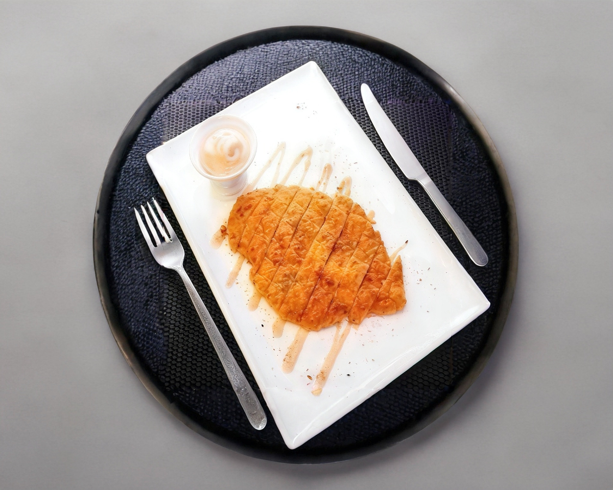 Pechuga de pollo rellena de queso manchego, verdura y empanizado.