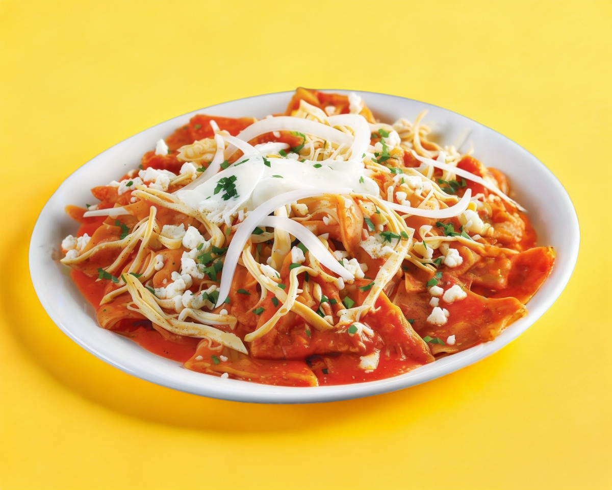 Tortilla de maíz frita bañada en salsa roja, acompañados de chorizo, queso, crema y cebolla acompañados de pan.