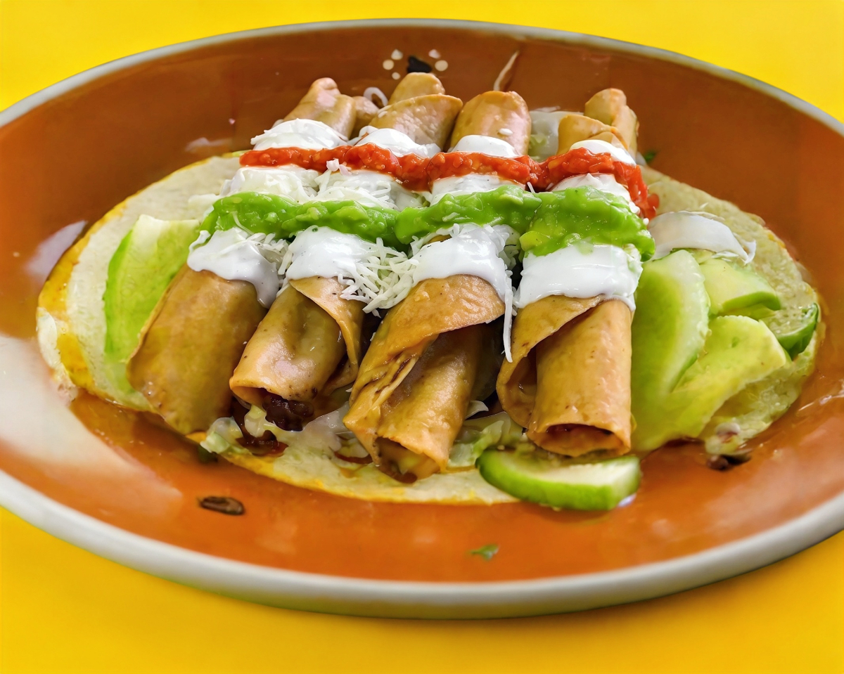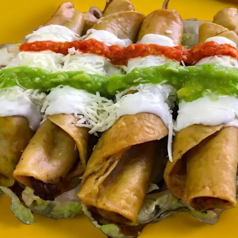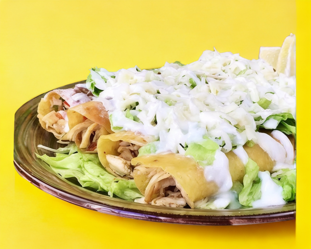 4 pzs de flautas de pollo con lechuga,queso y crema
