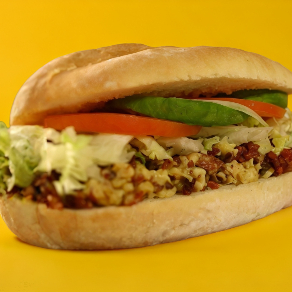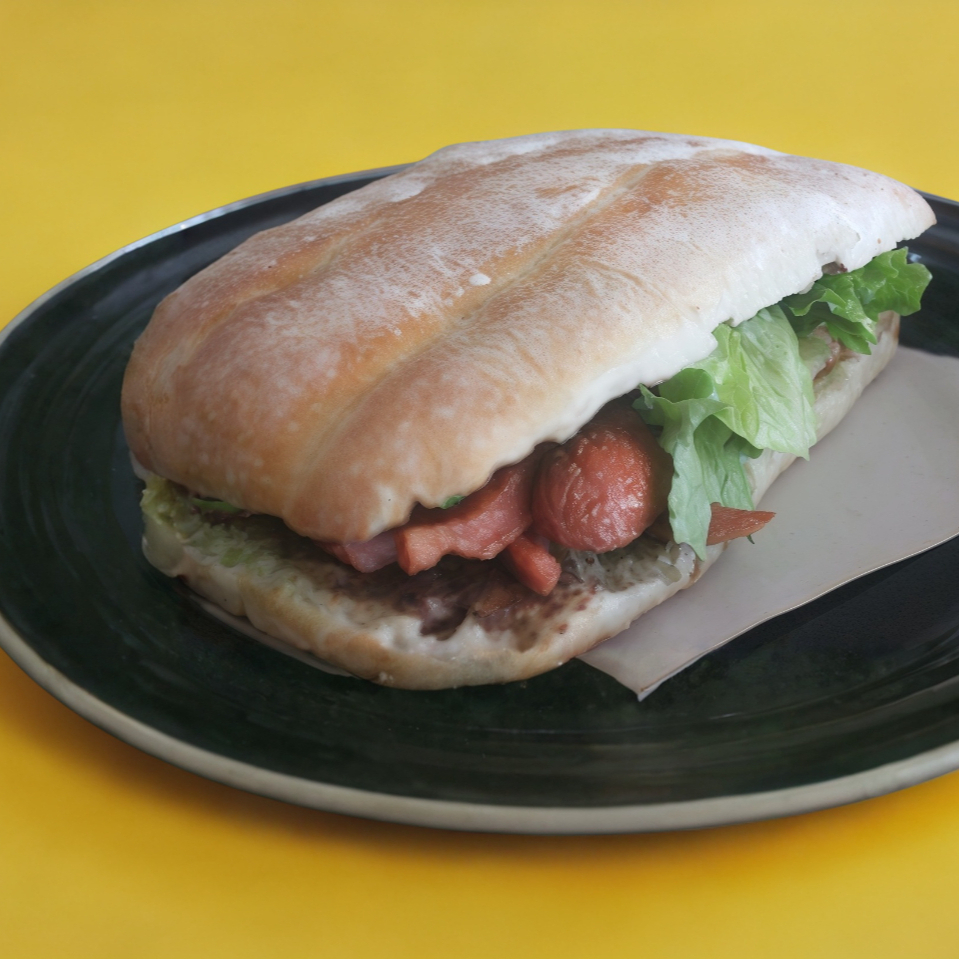 Torta de salchichas con frijoles, lechuga, mayonesa y jitomate.
