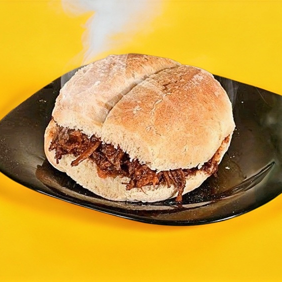 Torta rellena de chilaquiles en salsa roja con queso y crema.