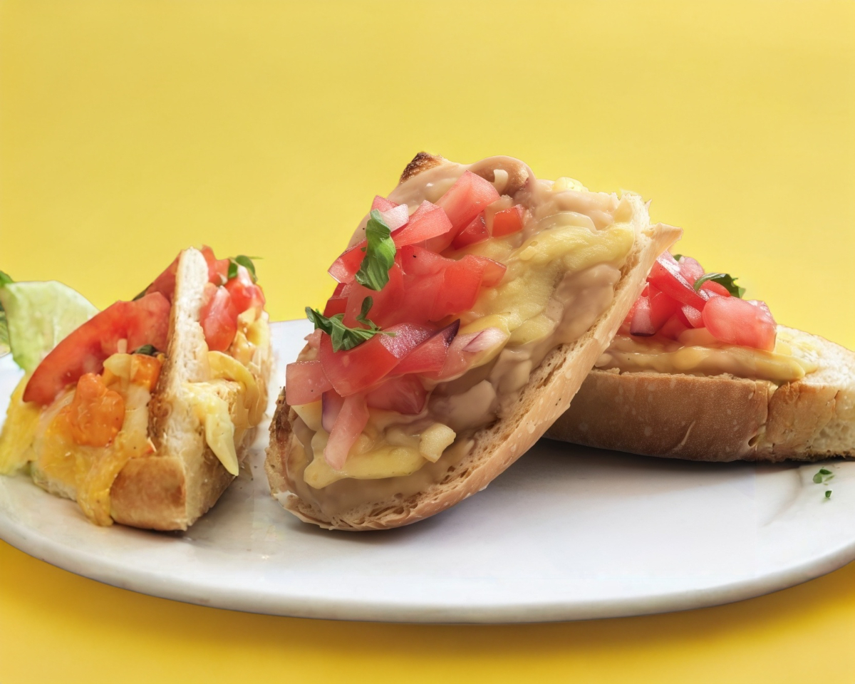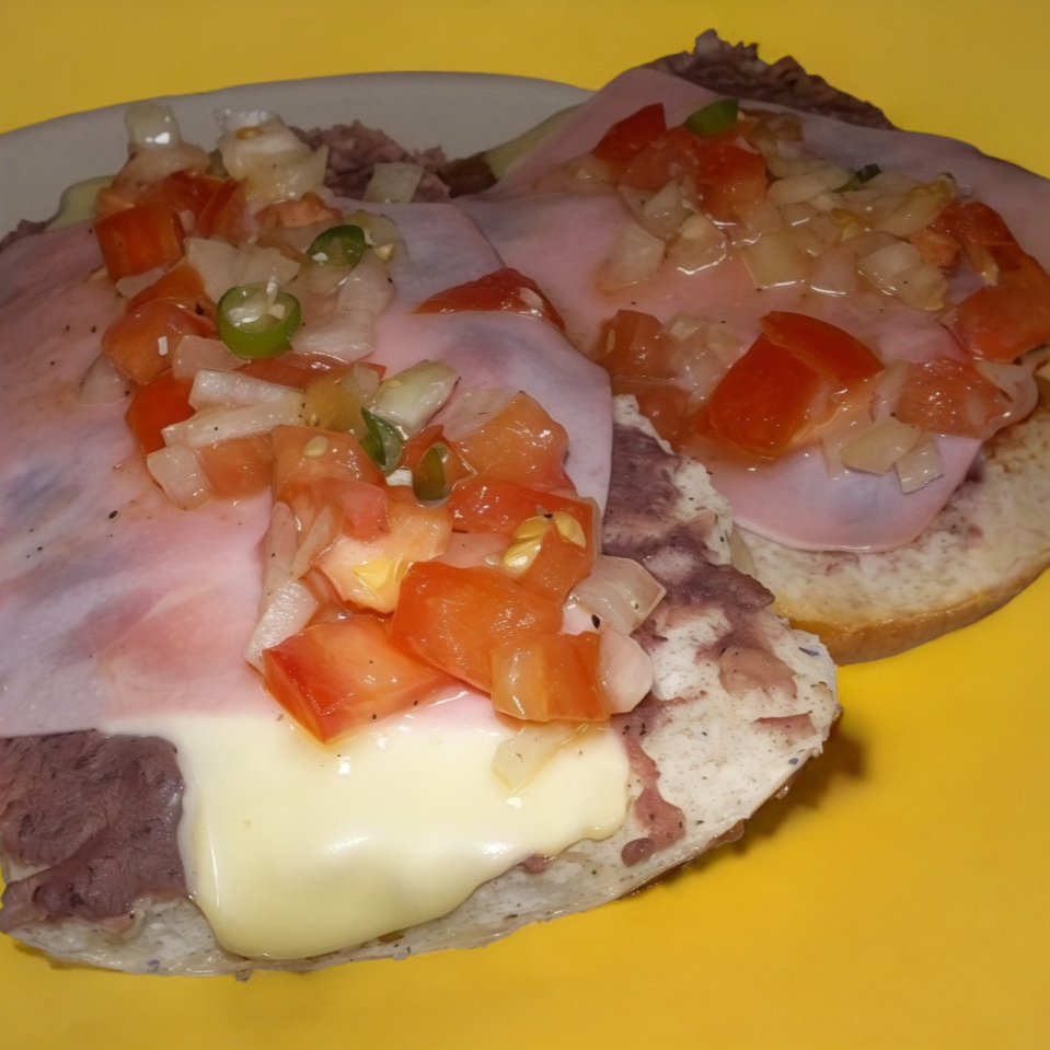 2 molletes con frijoles, queso, pico de gallo y jamon