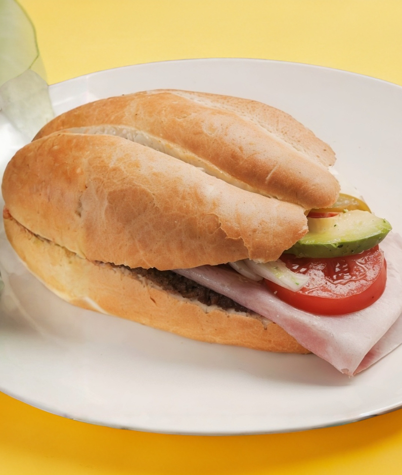 Torta de jamón con lechuga, frijoles, mayonesa y jitomate.