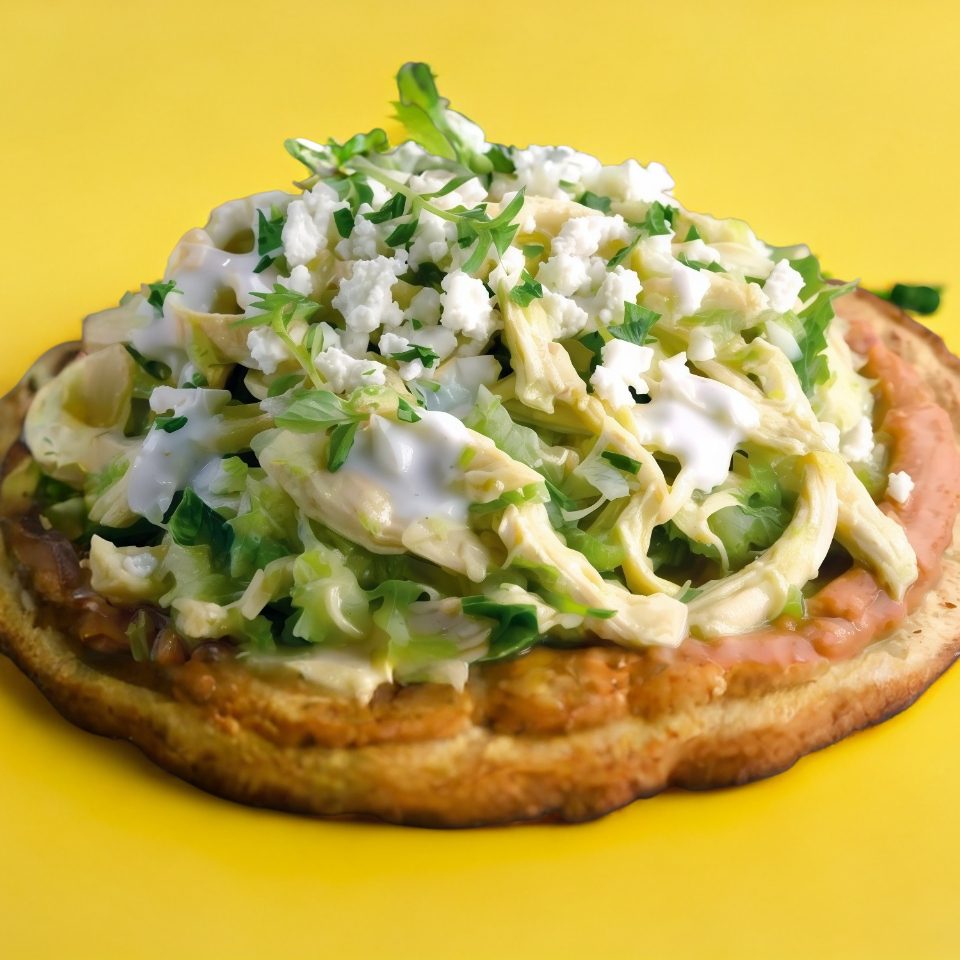 Tostada con frijoles, lechuga, pollo, queso y crema.