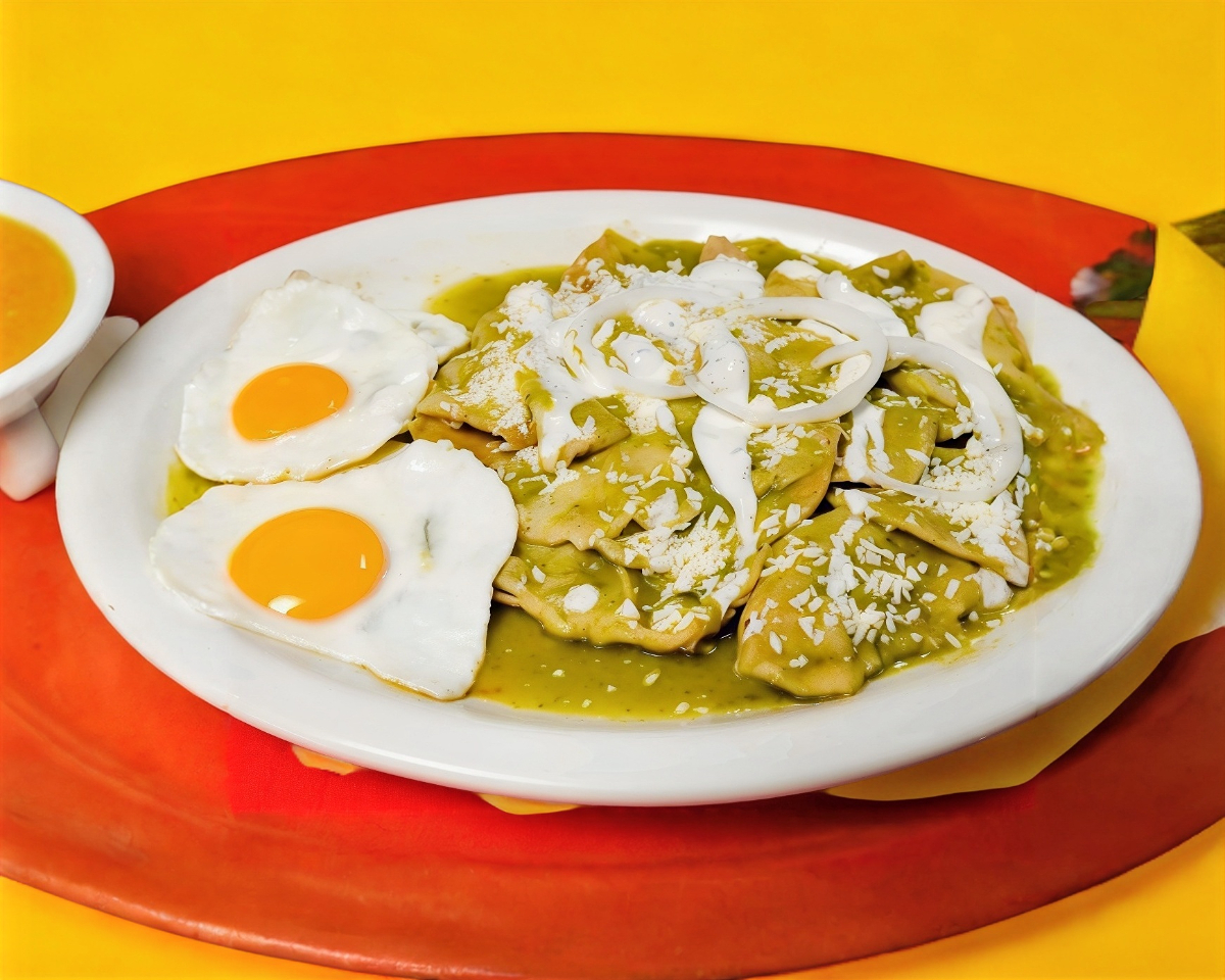 Tortilla de maíz frita bañada en salsa verde, acompañados de huevo frito, queso, crema y cebolla con pan.