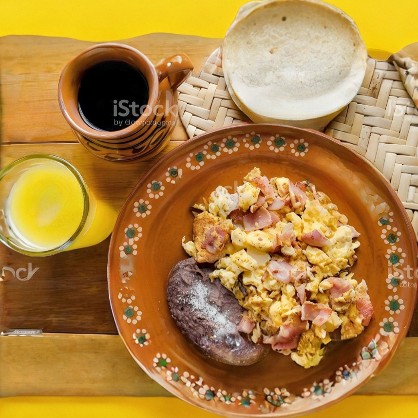 Tortilla de maíz frita bañada en salsa roja, acompañados de huevo revuelto con jamon, queso, crema y cebolla acompañados de pan.