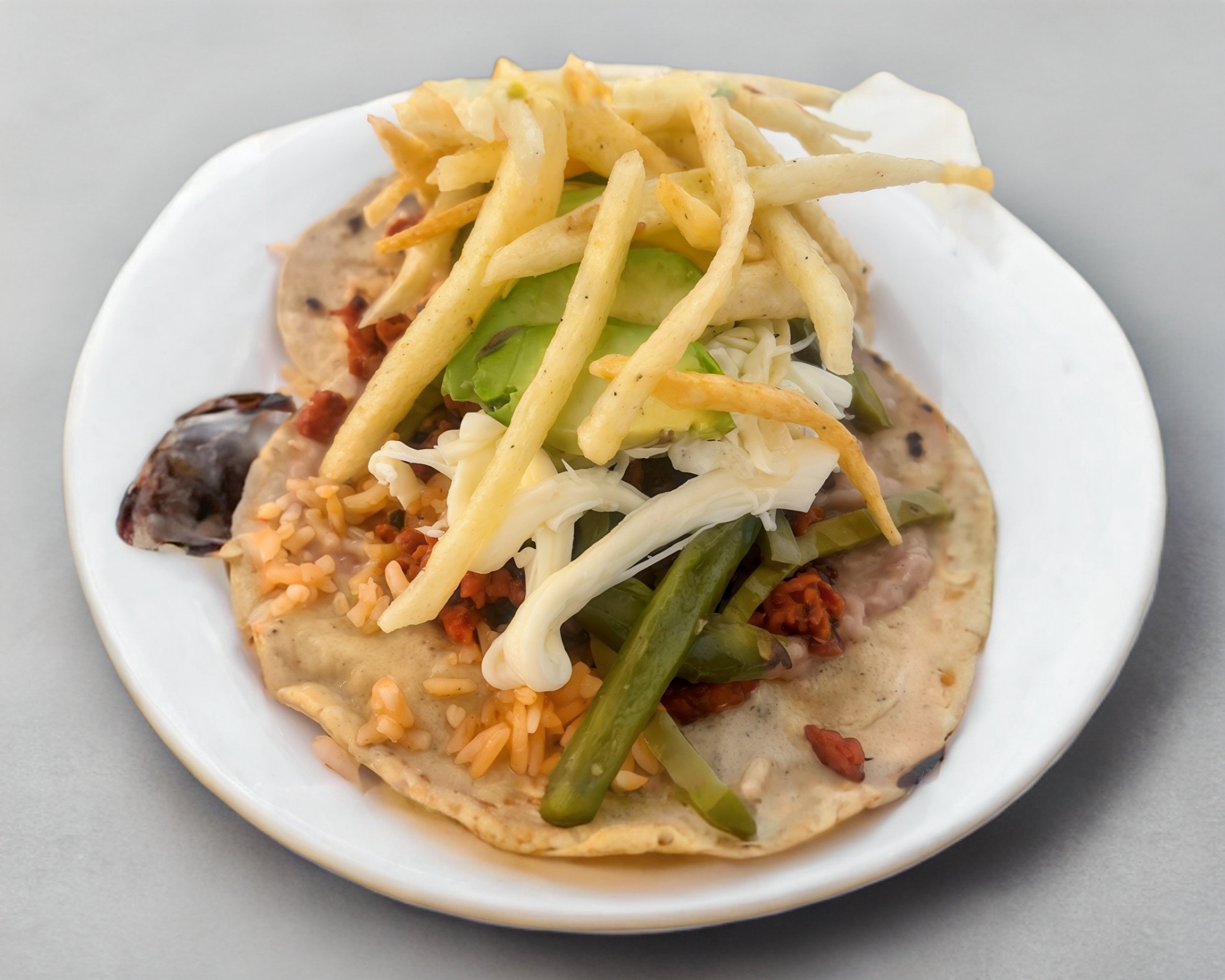Dos tortillas, frijoles refritos, arroz, proteina, nopales, rajas, quesillo, aguacate y papas fritas.