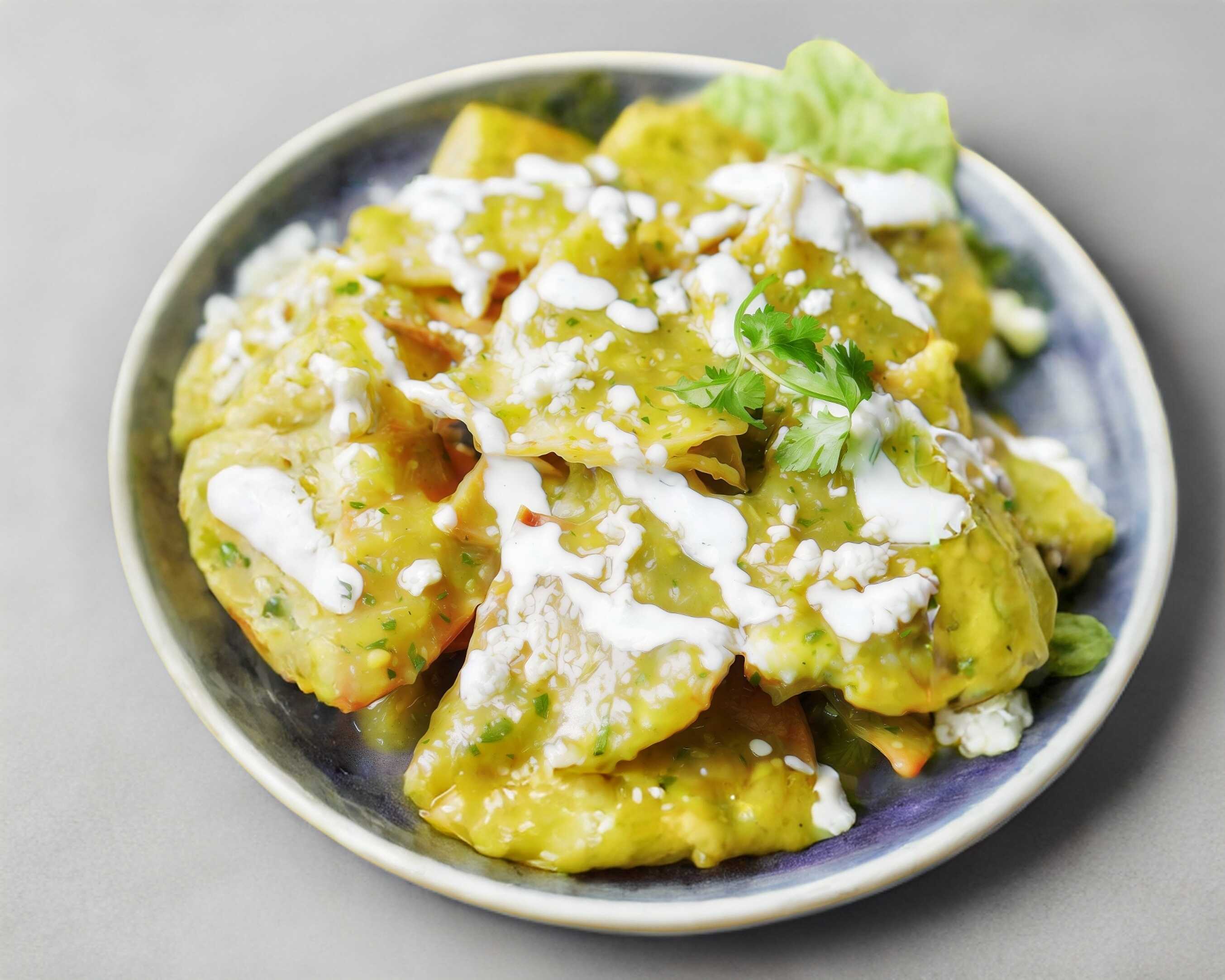 Salsa verde levanta crudas, cebolla, pollo asado, queso y crema.