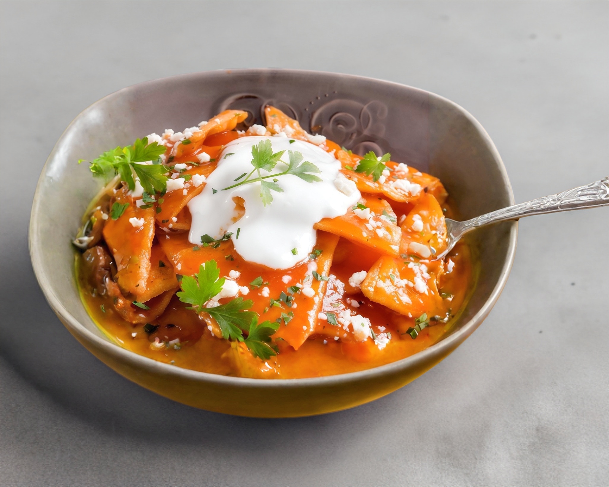 Salsa roja levanta crudas, cebolla, pollo asado, queso, crema.