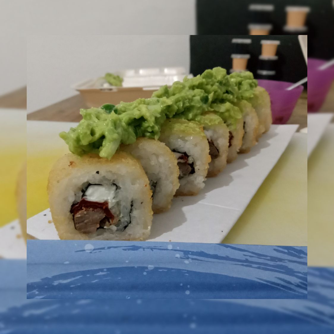 Relleno de arroz, alga nori, Queso crema, chipotle, cebollín y arrachera. Por fuera empanizado coronado con guacamole especial de la casa.