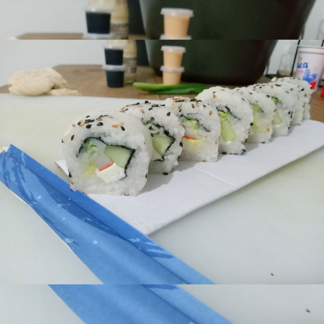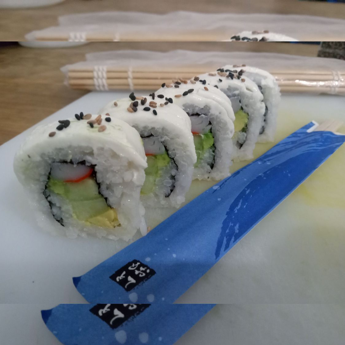 Pepino, aguacate, queso, surimi ... Por fuera ajonjolí.