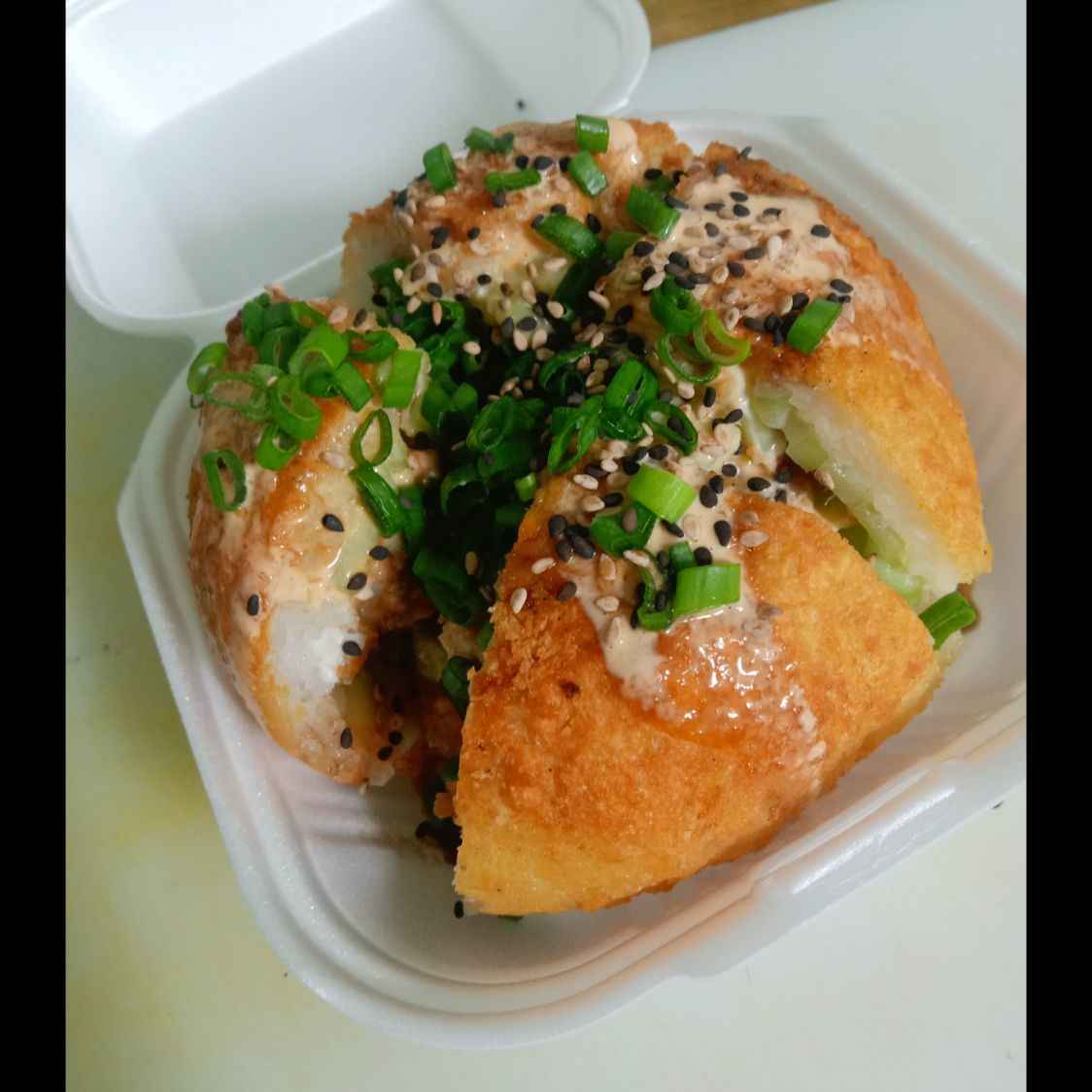Bola de arroz sushi rellena de queso crema, pepino, aguacate y surimi. Por fuera empanizada y bañada en aderezo chipotle, salsa de anguila., cebollin y ajonjolí
