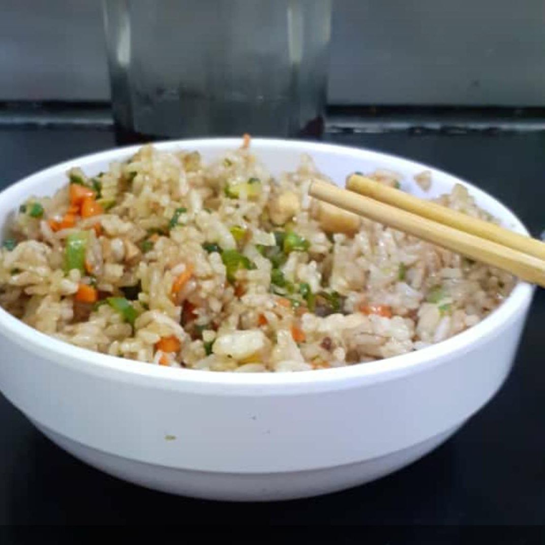 Arroz frito con verduras, huevo, sazonadas con soya, sal, pimienta y cebollín.