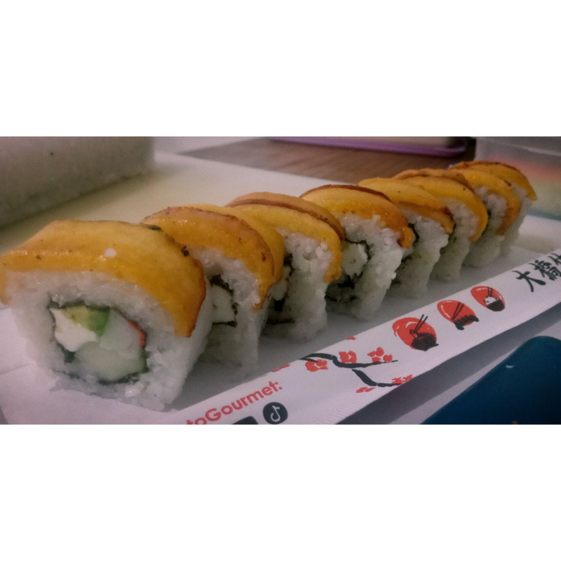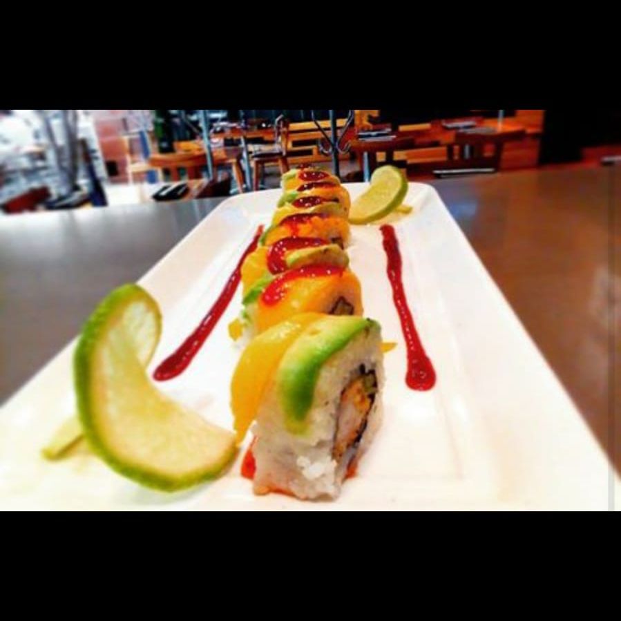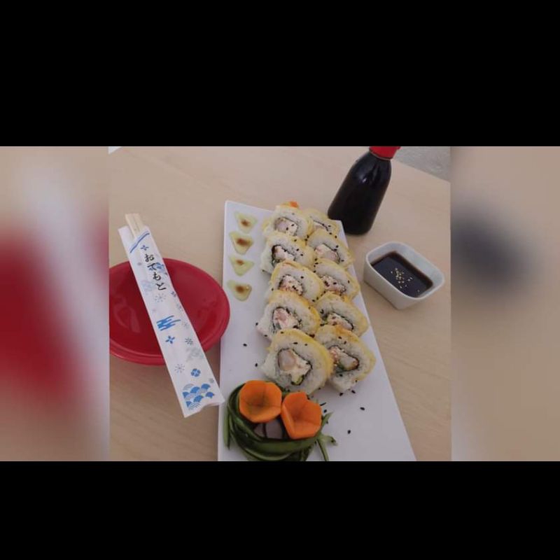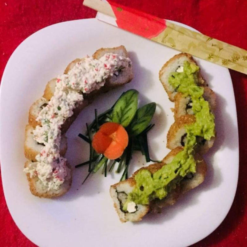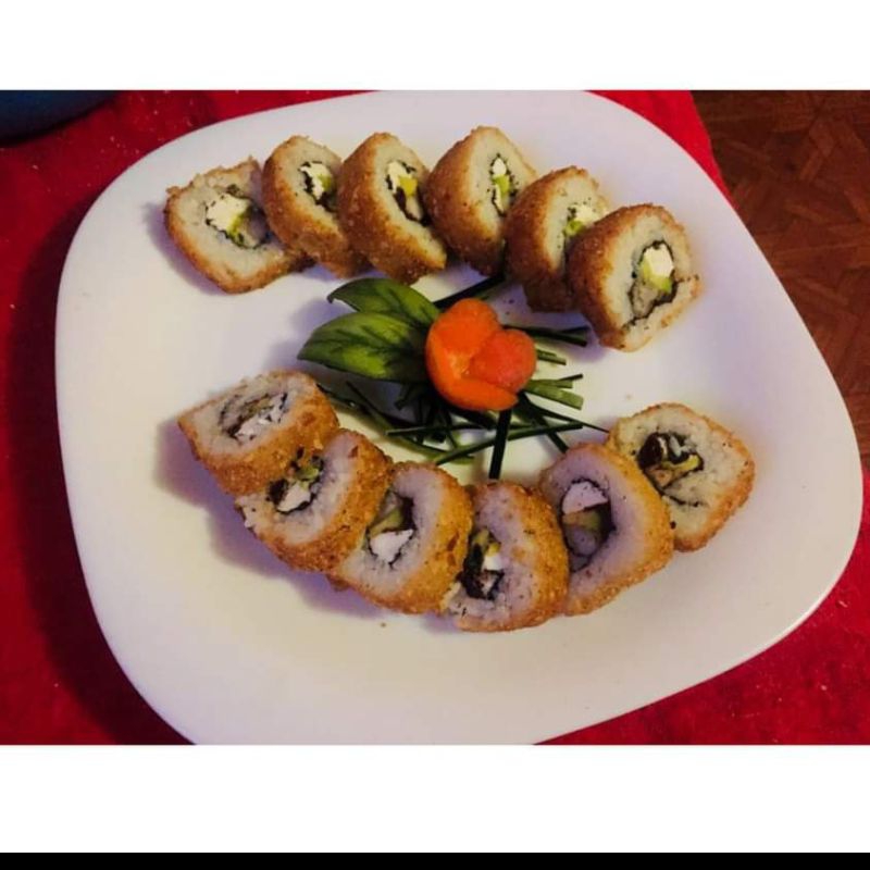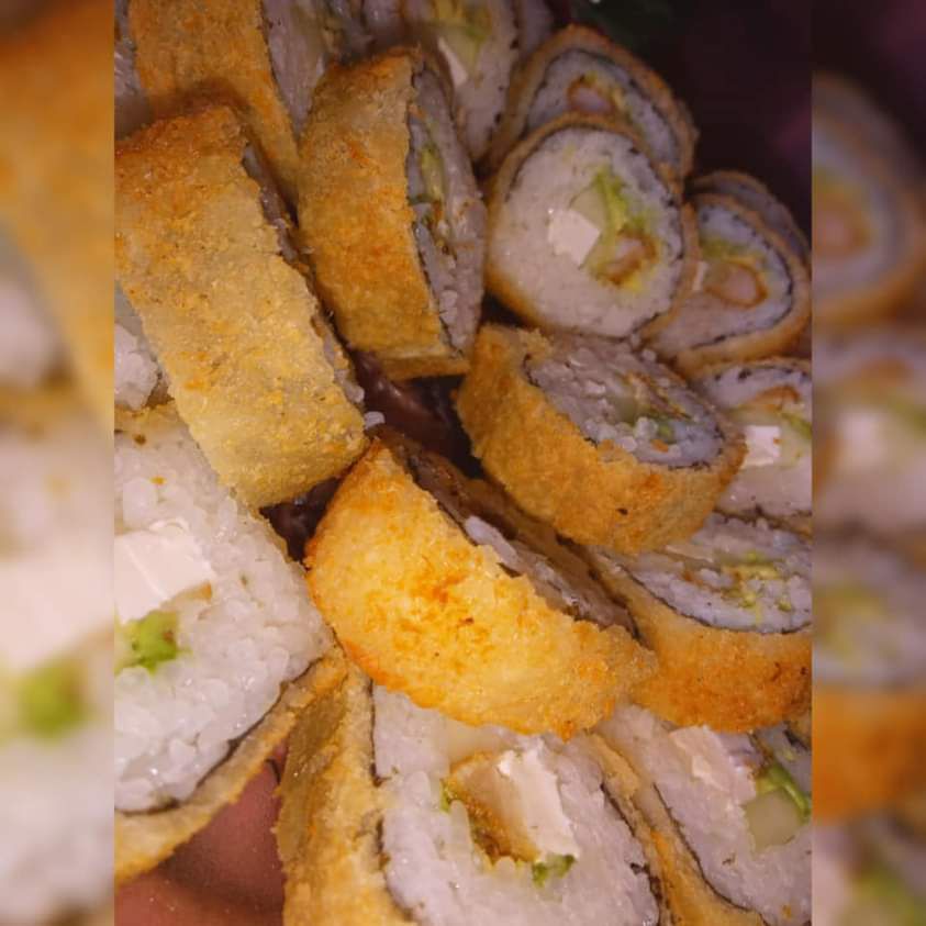 Relleno de alga nori, Aguacate, pepino, queso crema y surimi. Por fuera capeado al tempura, salsa de anguila y ajonjolí.