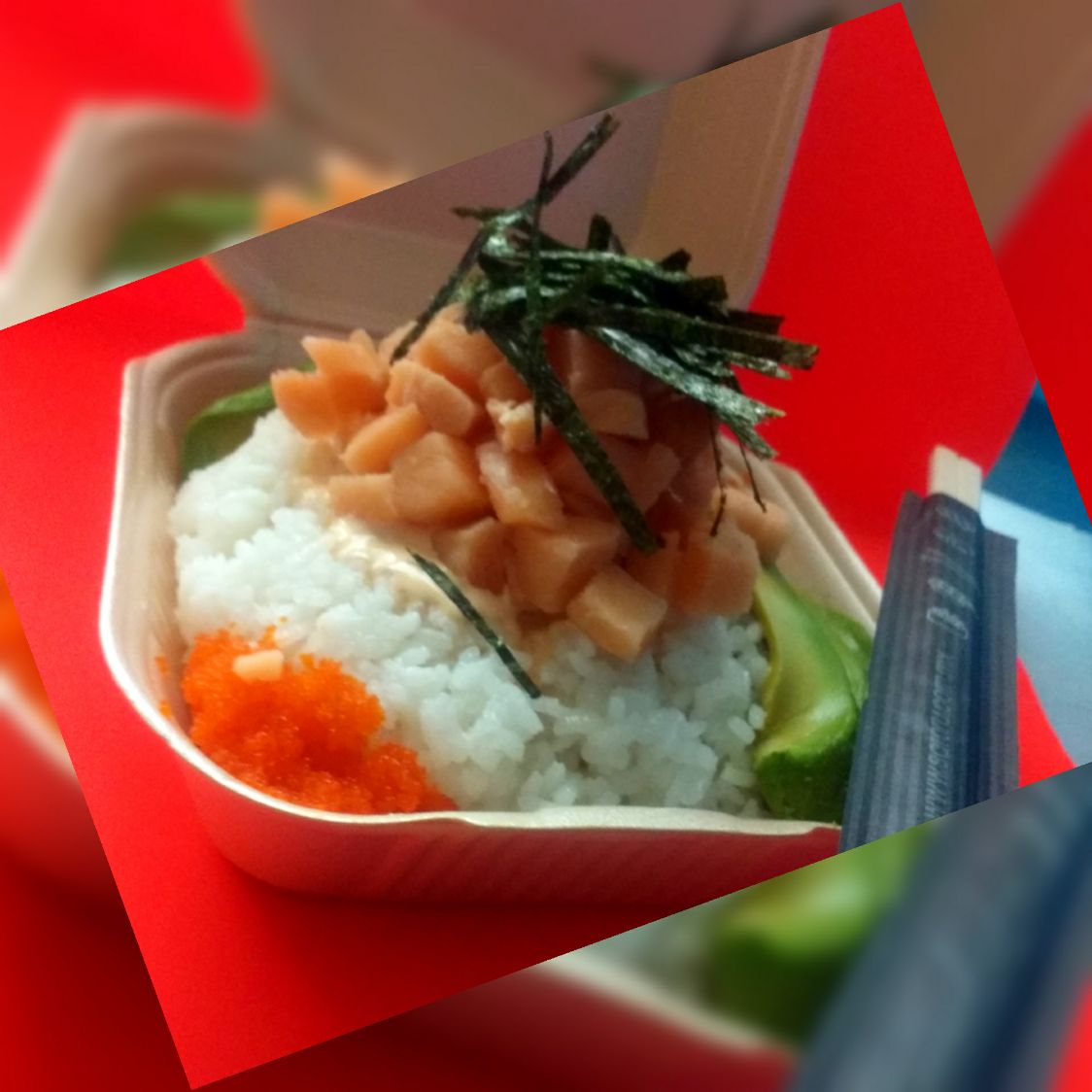 Base de arroz de sushi con aderezo chipotle, cebollín, masago, aguacate y salmón fresco.
