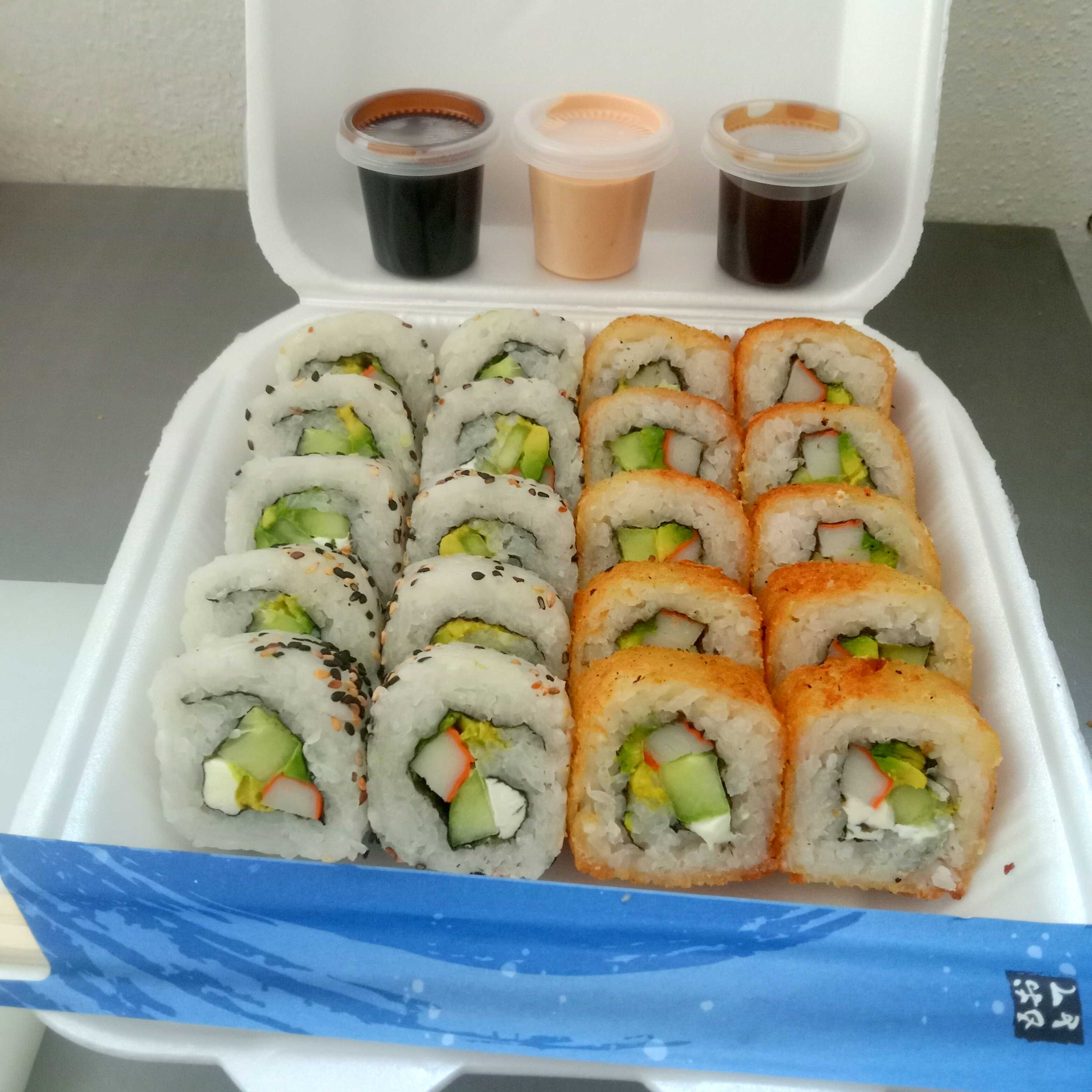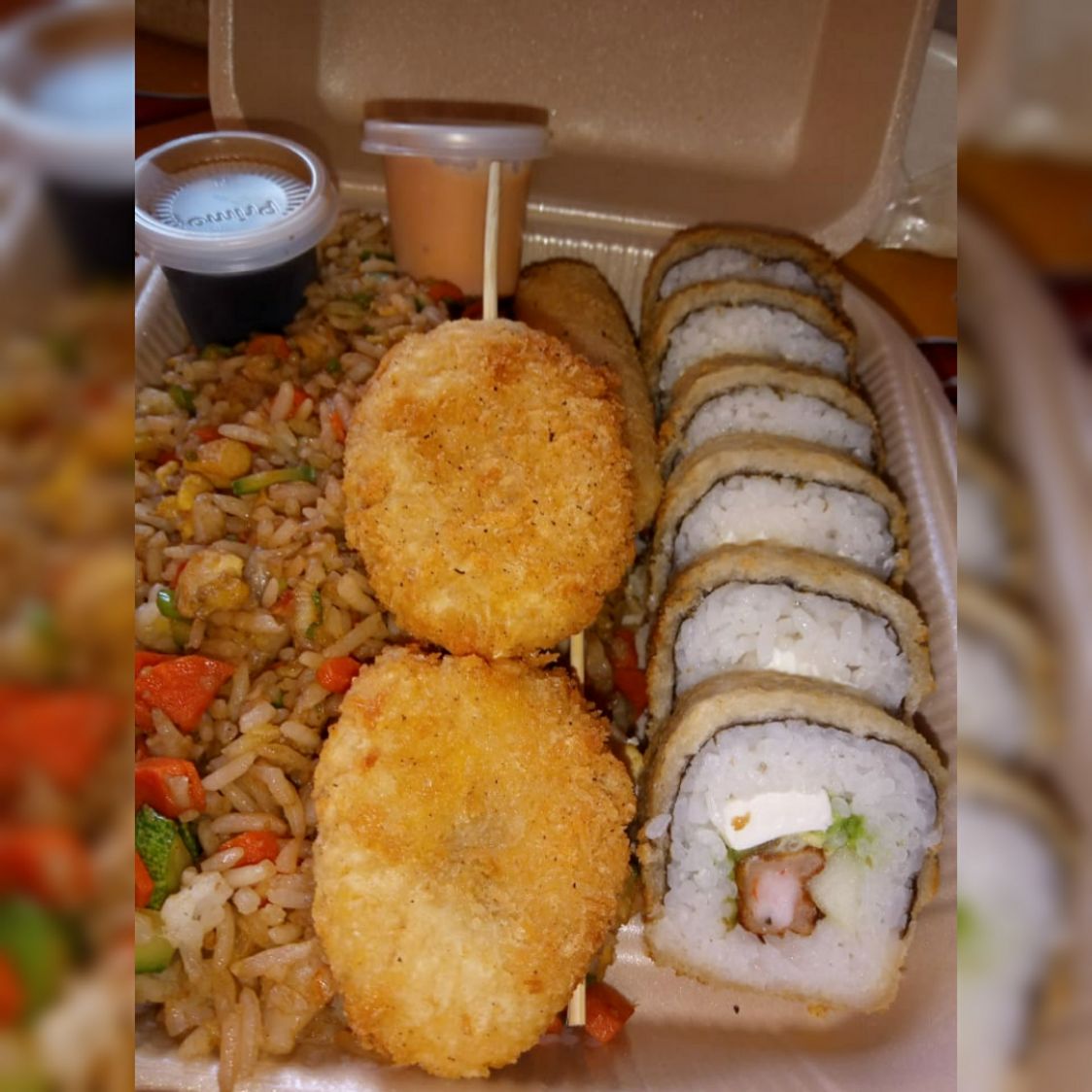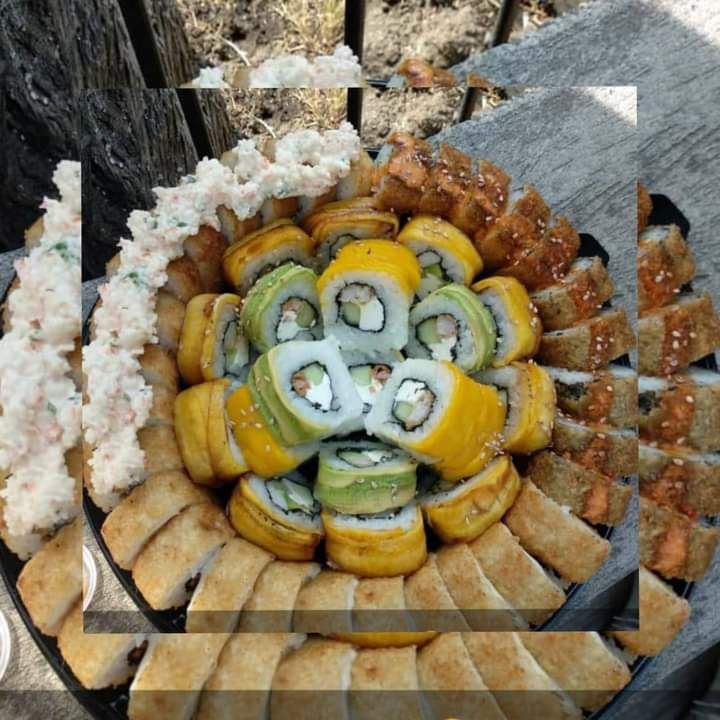 2 makis dulces (banana roll, dragón roll de mango y aguacate), 3 empanizados (empanizado especial , eby tampico, 1 empanizado de arrachera + 1 yakimeshi de regalo