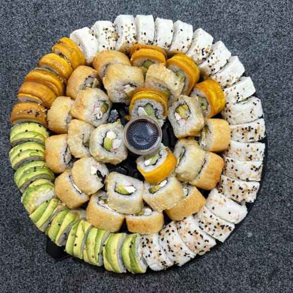 6 pzas de Maki dulce a elegir entre (banana roll, Avocado, Philadelphia o California) + Medio yakimeshi + 2 brochetas de plátano empanizado