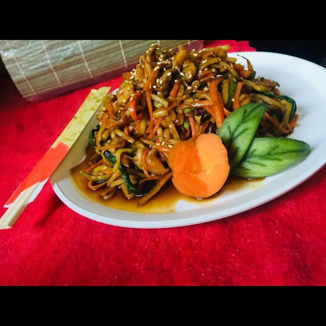 Pasta udon tradicional con zanahoria, calabaza, champiñon , salsa de anguila, ajonjolí y camarones .
