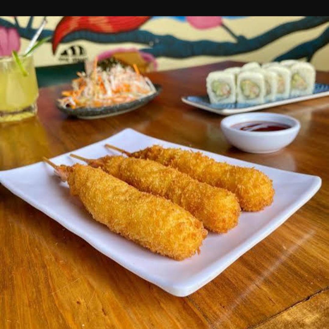 4 Piezas, camarones con queso crema, arroz de sushi y cebollín, acompañados con aderezo de chipotle.