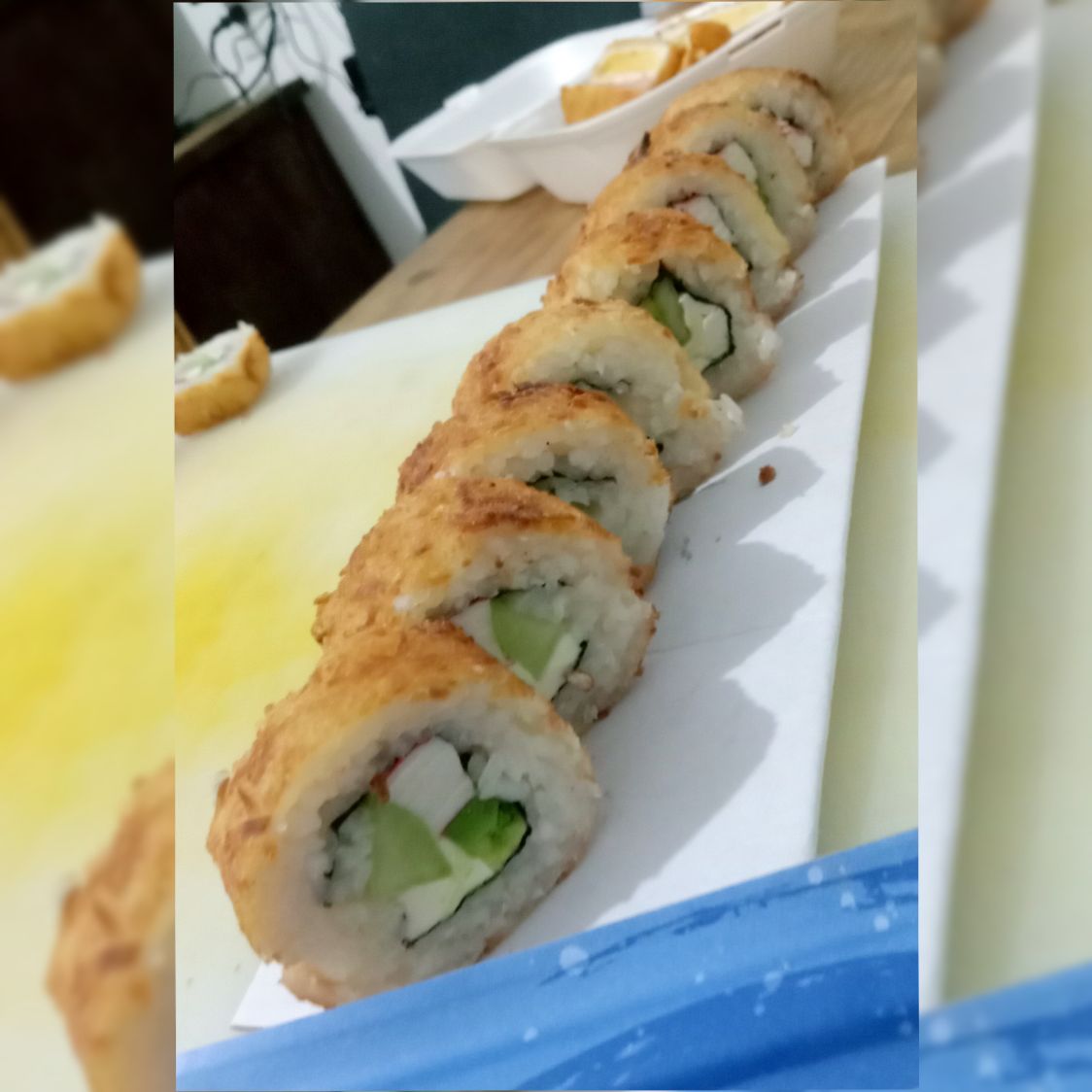 Relleno de alga nori ,Pepino, aguacate, queso y surimi empanizado. Por fuera empanizado con coco rallado.