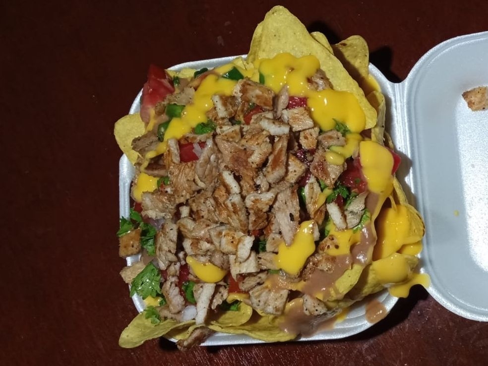 Totopos, Frijoles, Queso amarillo, Jalapeño en rodajas