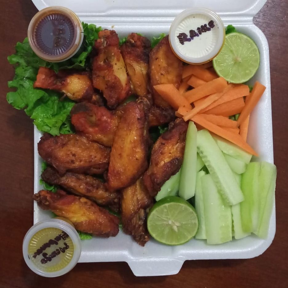 Alitas*12 piezas, lechuga, zanahoria, y pepino 2 aderezos