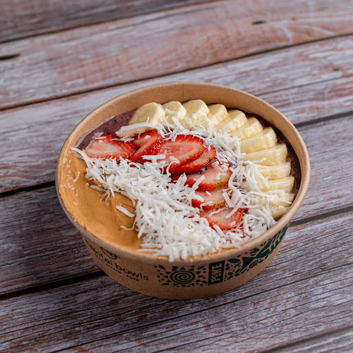 Poke con base de açaí orgánico, plátano, fresa, mantequilla de maní y coco orgánico