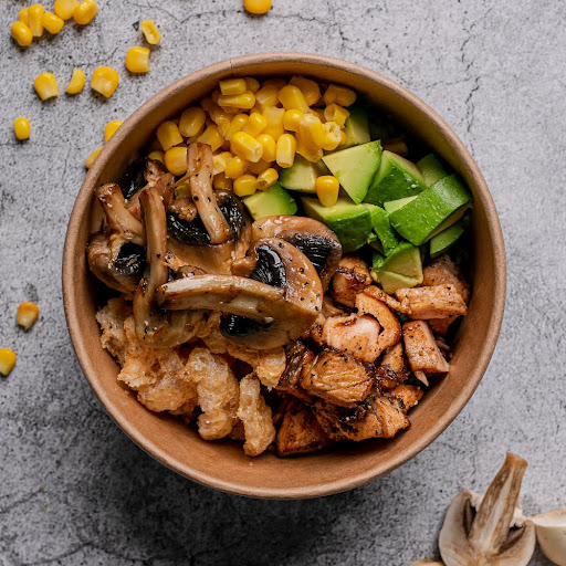 Poke con arroz integral, lechuga italiana (hidropónica), pollo asado, mayo chipotle, pimientos y cebollas asadas, granos de elote, aguacate, soya preparada y salsa agridulce.
