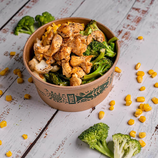 Poke con arroz de coliflor, pollo asado, aguacate, brócoli asado, granos de elote, cebolla cambray asada, espárragos asados.
