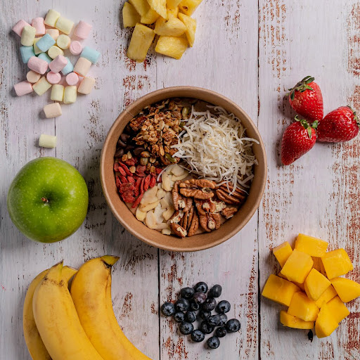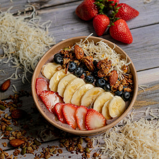 Poke con base de açai orgánico, fresa, plátano, blueberry, granola, coco orgánico y miel de abeja orgánica.